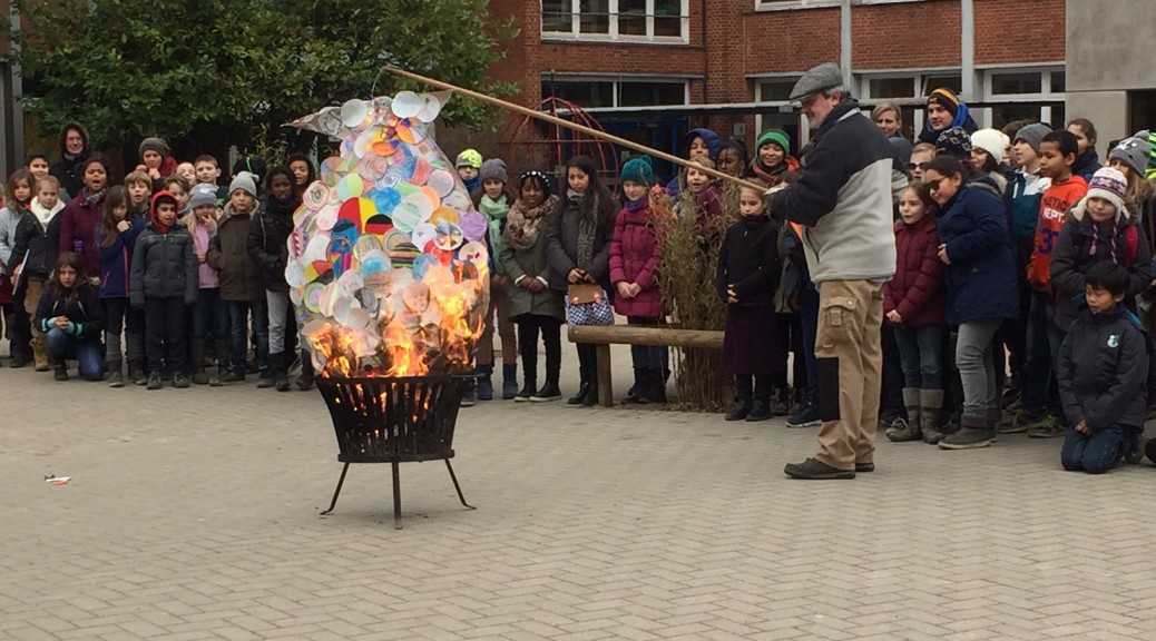 Alle Kinder tragen an diesem Tag bitte dunkle Klamotten . Anschließend haben sie einen großen Kreis gebildet. Die Schüler der Klasse 4b sind mit der Sardine herausgekommen, die in der Mitte des Kreises verbrannt worden ist.
